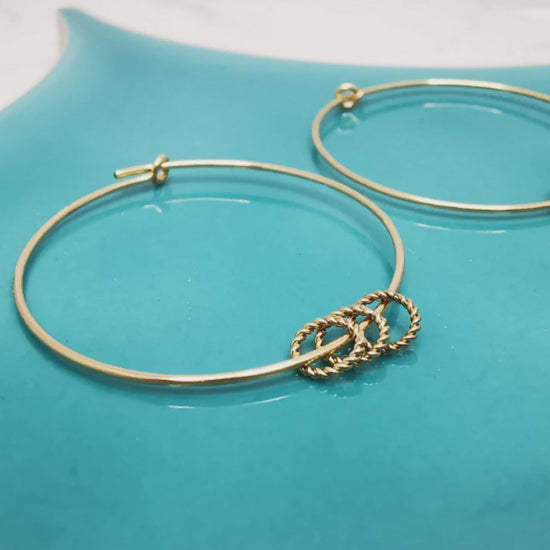 A gorgeous pair of gold hoops, each featuring three individual gold ring charms. A pretty piece, perfect for everyday wear.