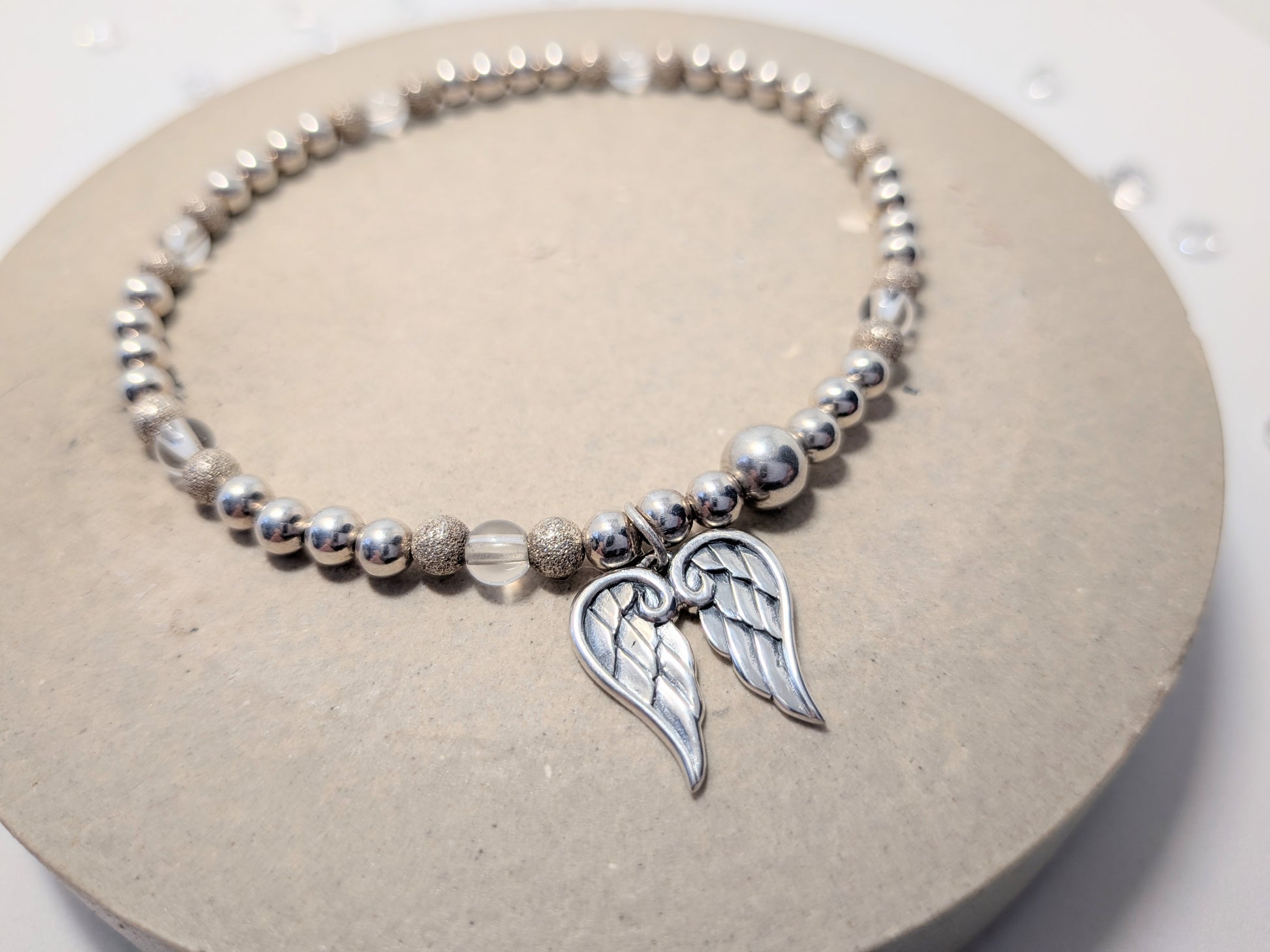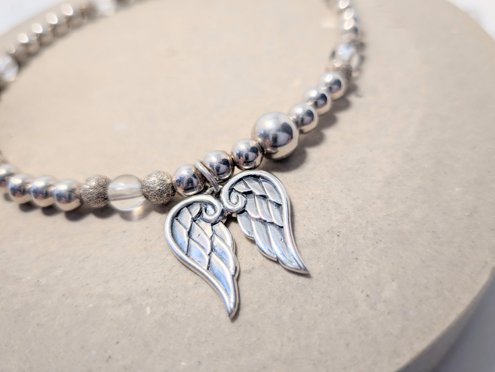 Sterling silver beaded bracelet with a sterling silver angel wing charm and signature sterling silver Sophellie heart tag.
